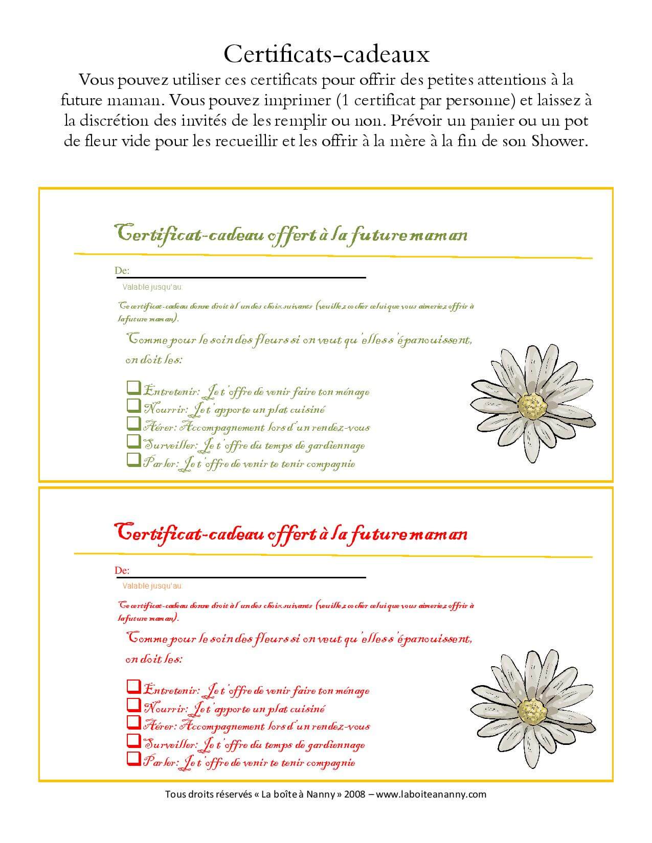 - chèques-cadeaux à offrir à la future maman (si les invités voulaient offrir du temps de gardiennage, plat préparé, etc. ils peuvent remplir et offrir ces certificats)