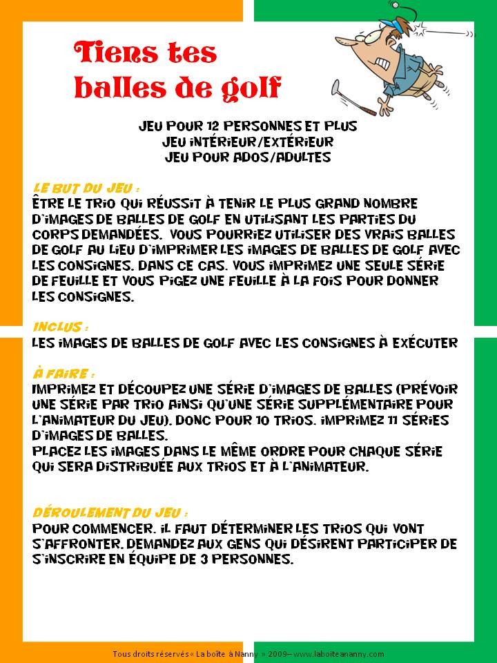 Tiens tes balles de golf est un jeu d’ambiance sur le thème du golf. Ce jeu pourrait être utilisé lors d’un party à thème sur le golf ou lors d’un tournoi de golf pour animer la soirée.